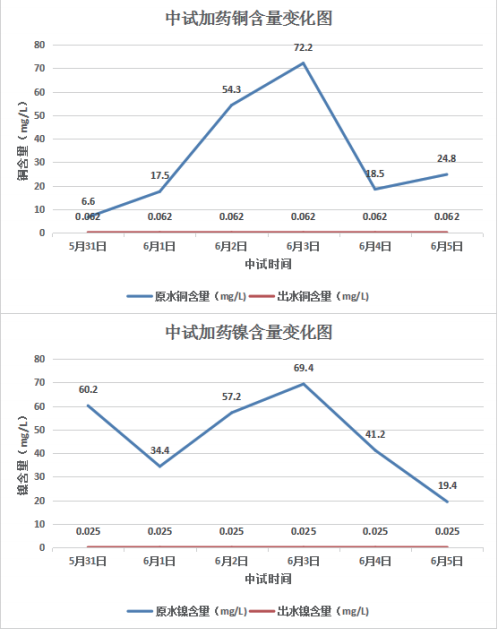 1.在投加破絡(luò)劑總量為850kg,重金屬捕捉劑總量為100kg時(shí),出水總銅穩(wěn)定在0.062mg/L,總鎳穩(wěn)定在0.025mg/L,達(dá)到排放標(biāo)準(zhǔn)。