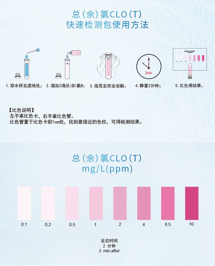 2、本產(chǎn)品檢測水中總(余)氯ClO(T)含量在0~10mg/L(ppm)范圍內(nèi),濃度過高會產(chǎn)生紅色沉淀而影響比色,若要檢測10mg/L以上濃度水樣,請預(yù)先稀釋水樣后再進行測定,具體操作見稀釋說明書。。