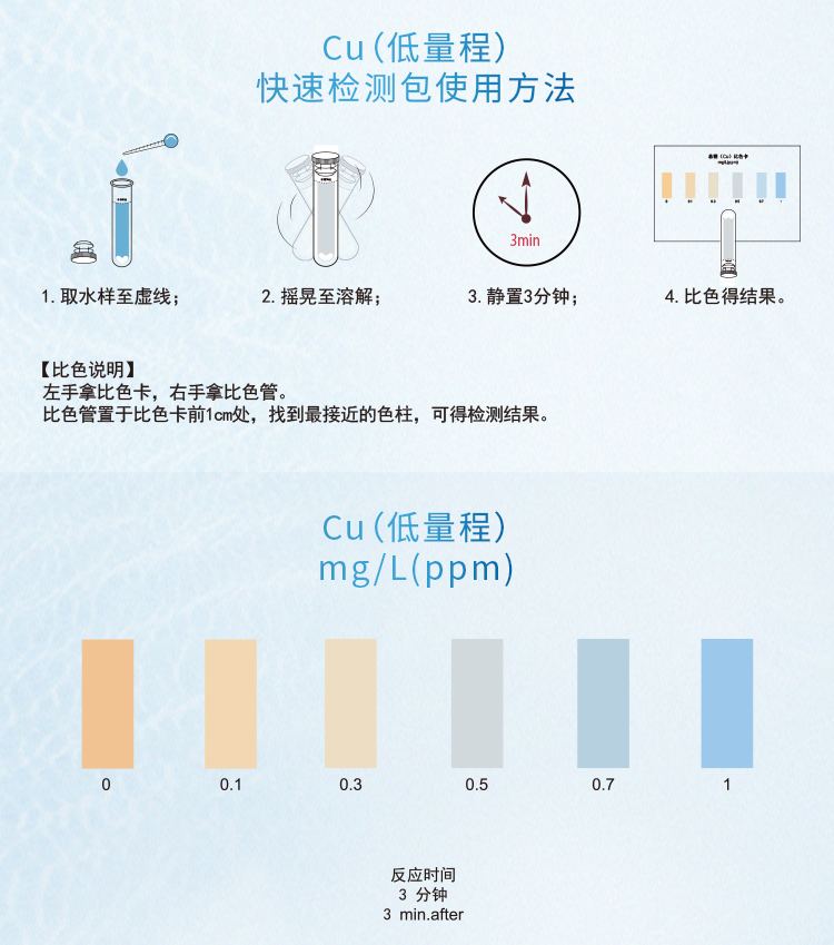 3.水體中銅主要以較穩(wěn)定的二價(jià)銅形式存在,故本產(chǎn)品以測(cè)定二價(jià)銅來(lái)判斷水中總銅含量。