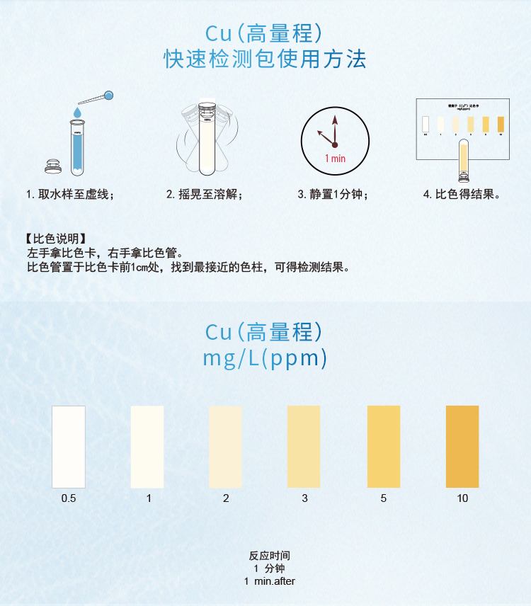 2.本產(chǎn)品檢測(cè)水中銅離子(Cu2+)含量在0.5-10mg/L(ppm)范圍內(nèi),濃度過(guò)高會(huì)產(chǎn)生黃棕色沉淀而影響比色,若要檢測(cè)10mg/L以上濃度水樣,請(qǐng)預(yù)先稀釋水樣后再進(jìn)行測(cè)定,具體操作見(jiàn)稀釋說(shuō)明書(shū)。