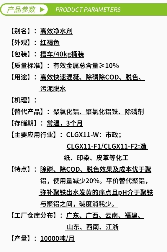 兼具鐵鹽的沉降速度快,處理成本低和鋁鹽的凈水效果優(yōu)良的特點(diǎn),是一種新型復(fù)合的無(wú)機(jī)高分子凈水劑,具備高效除磷、除COD、除油除濁、脫色等功效。