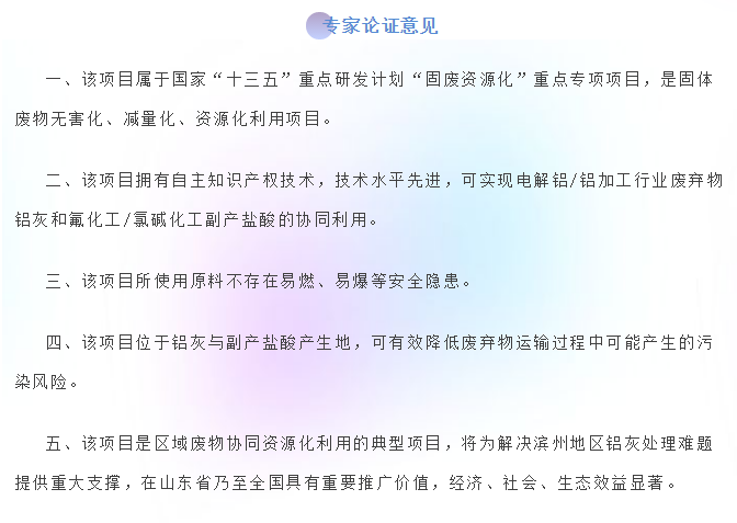 與會(huì)專家聽取了建設(shè)企業(yè)及技術(shù)團(tuán)隊(duì)對(duì)技術(shù)總體情況的匯報(bào)。在充分質(zhì)詢、討論后,專家一致認(rèn)為,本項(xiàng)目技術(shù)路線合理、前期基礎(chǔ)扎實(shí),可實(shí)現(xiàn)電解鋁/鋁加工鋁灰和副產(chǎn)鹽酸的協(xié)同利用,屬典型的資源循環(huán)利用項(xiàng)目。